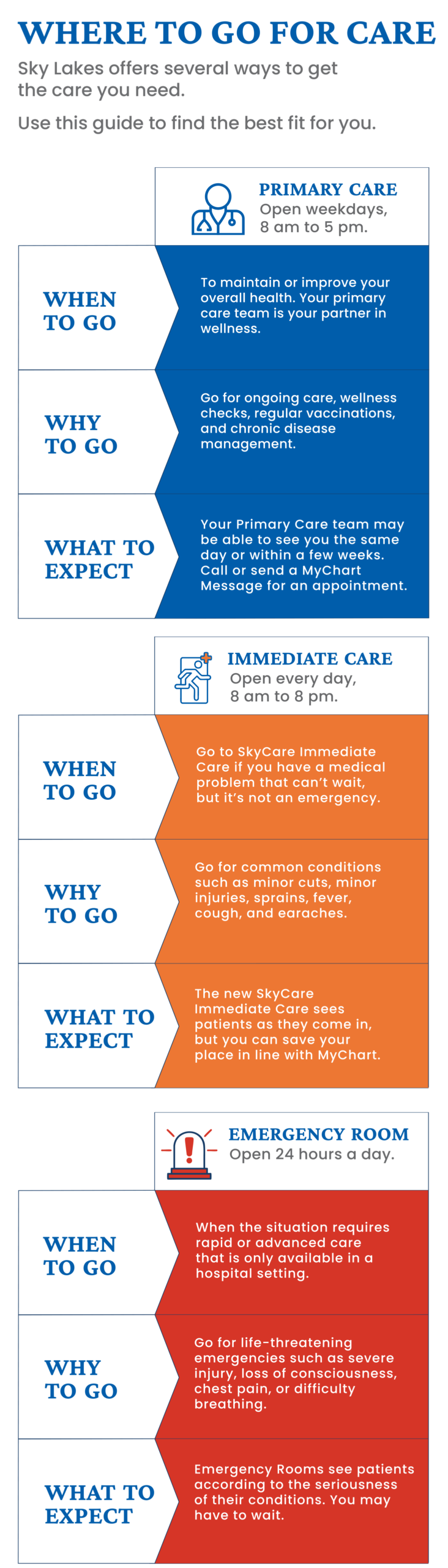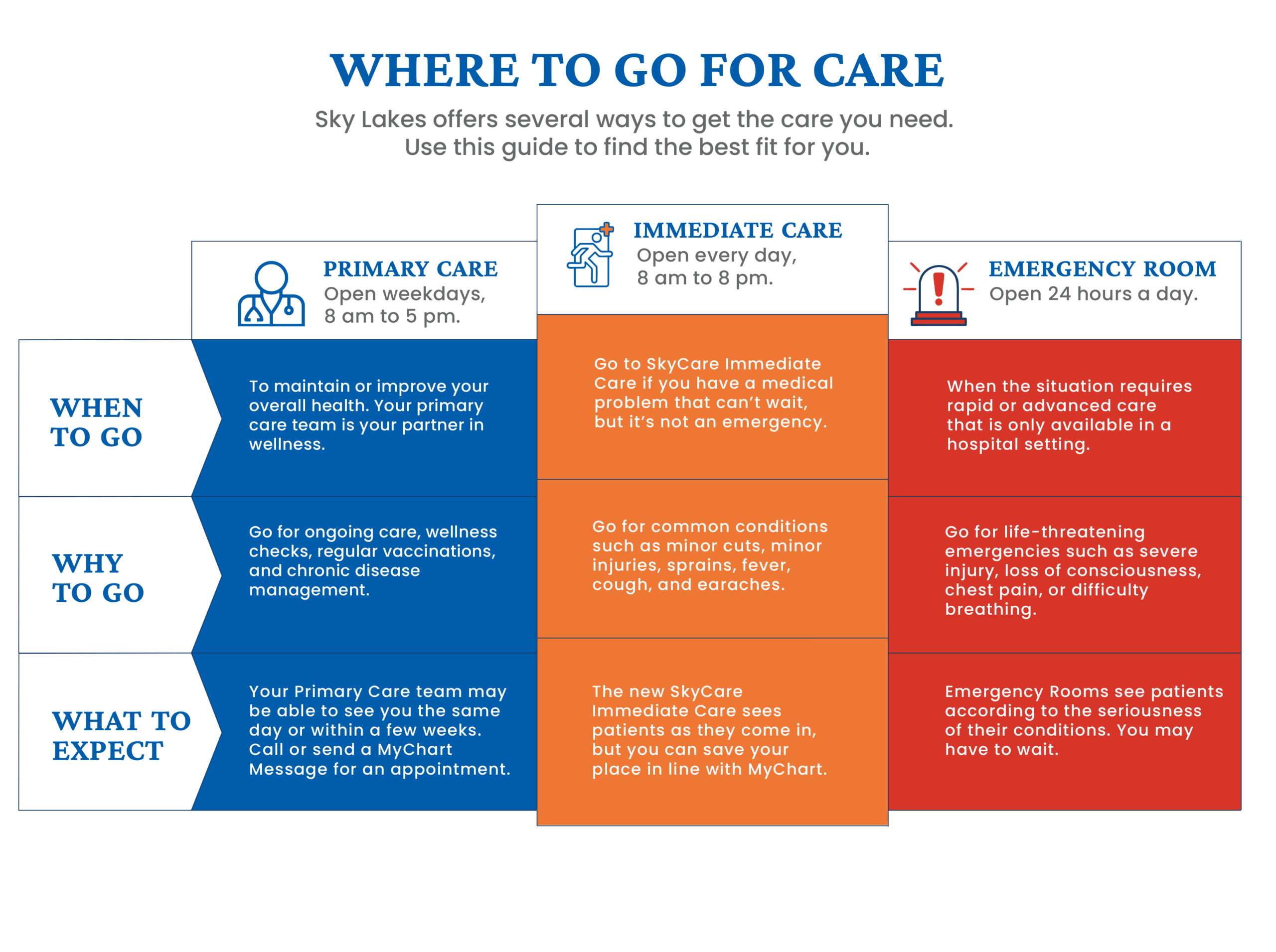 SkyCare is Sky Lakes Medical Center’s immediate care clinic in Klamath Falls. It provides walk-in care for non-emergency health concerns like minor illnesses and injuries when your regular doctor isn’t available.